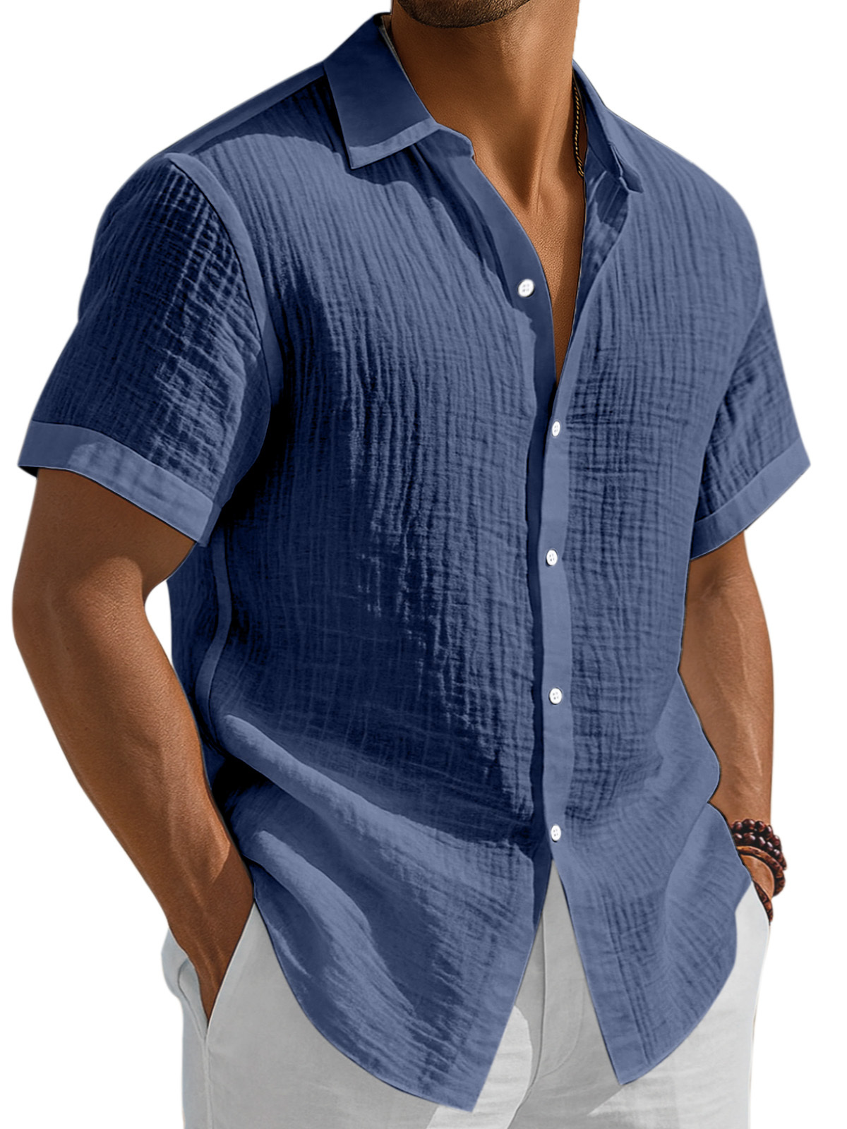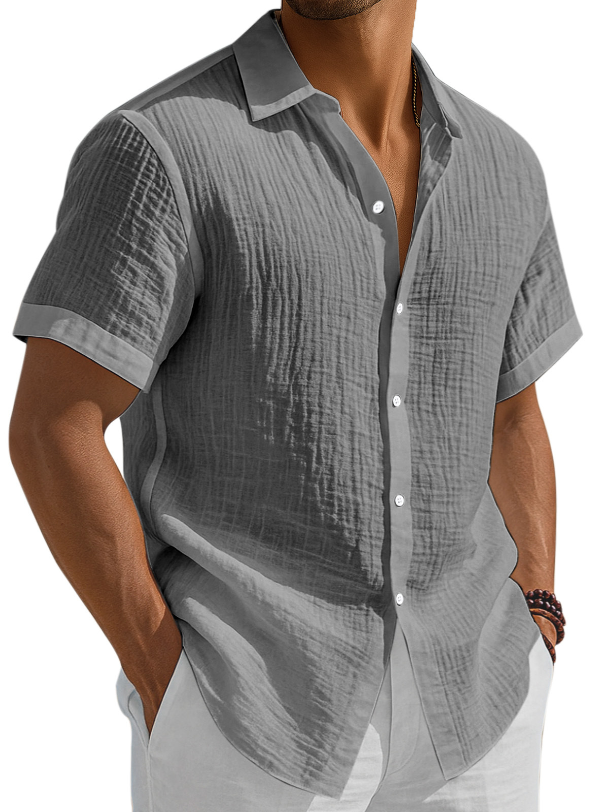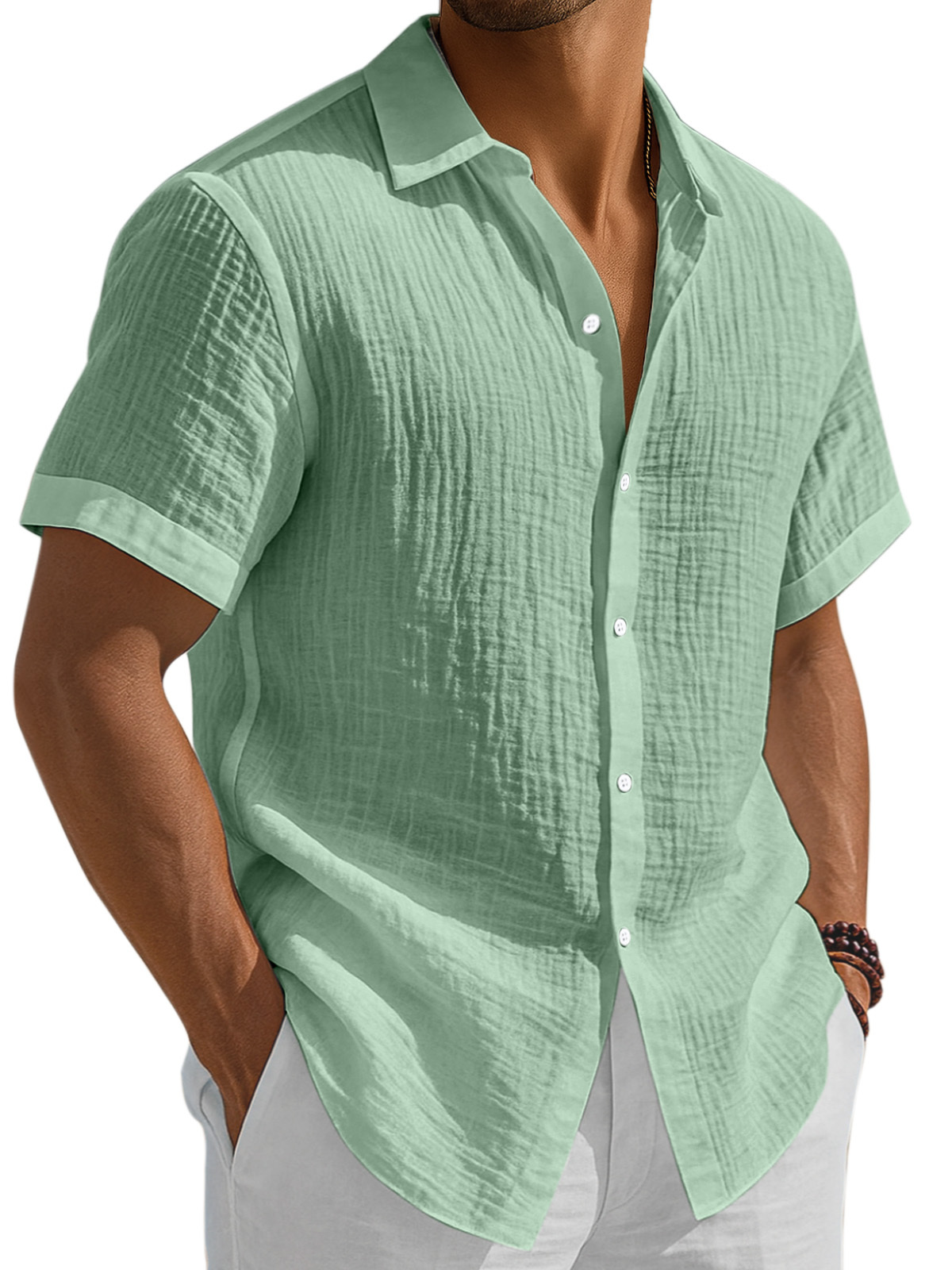 Men's Casual Solid Color Breathable Pleated Button Short Sleeve Shirt