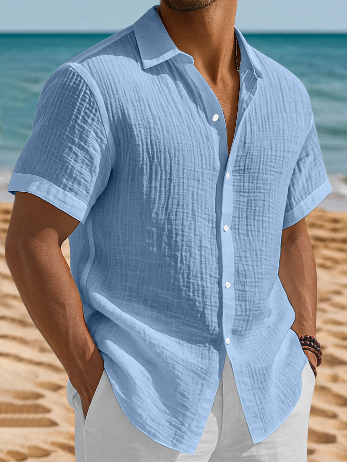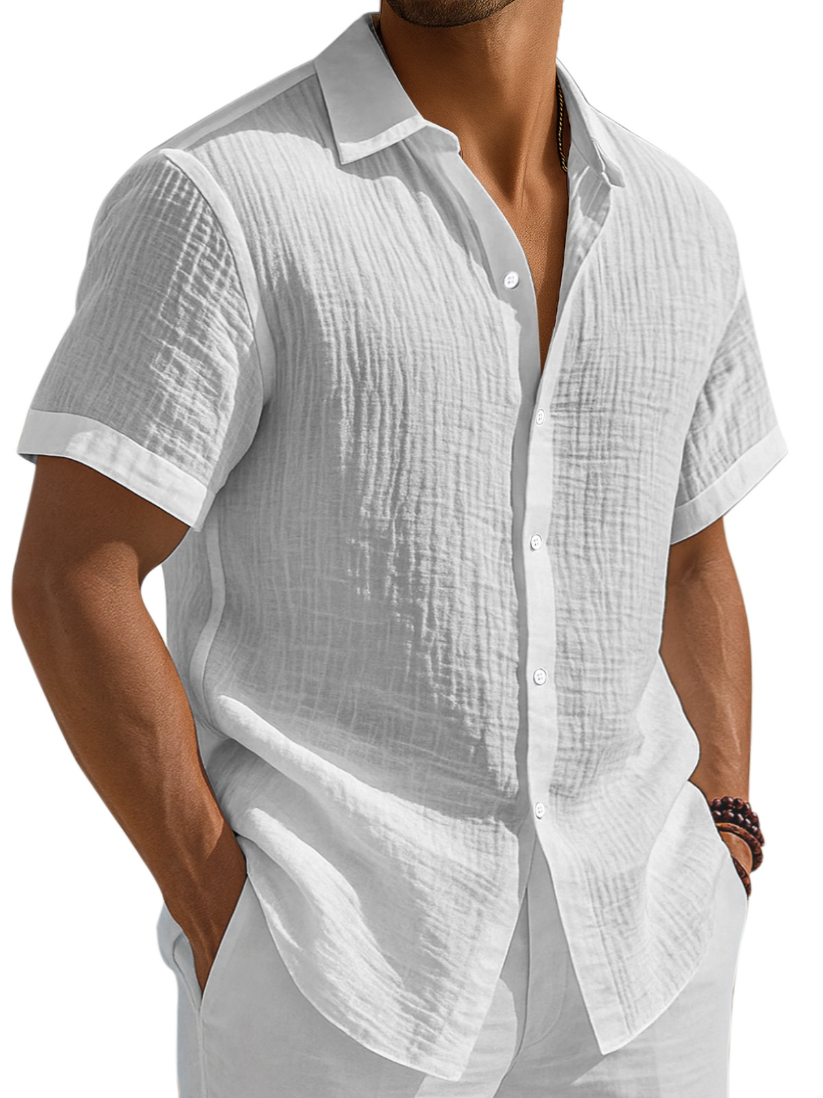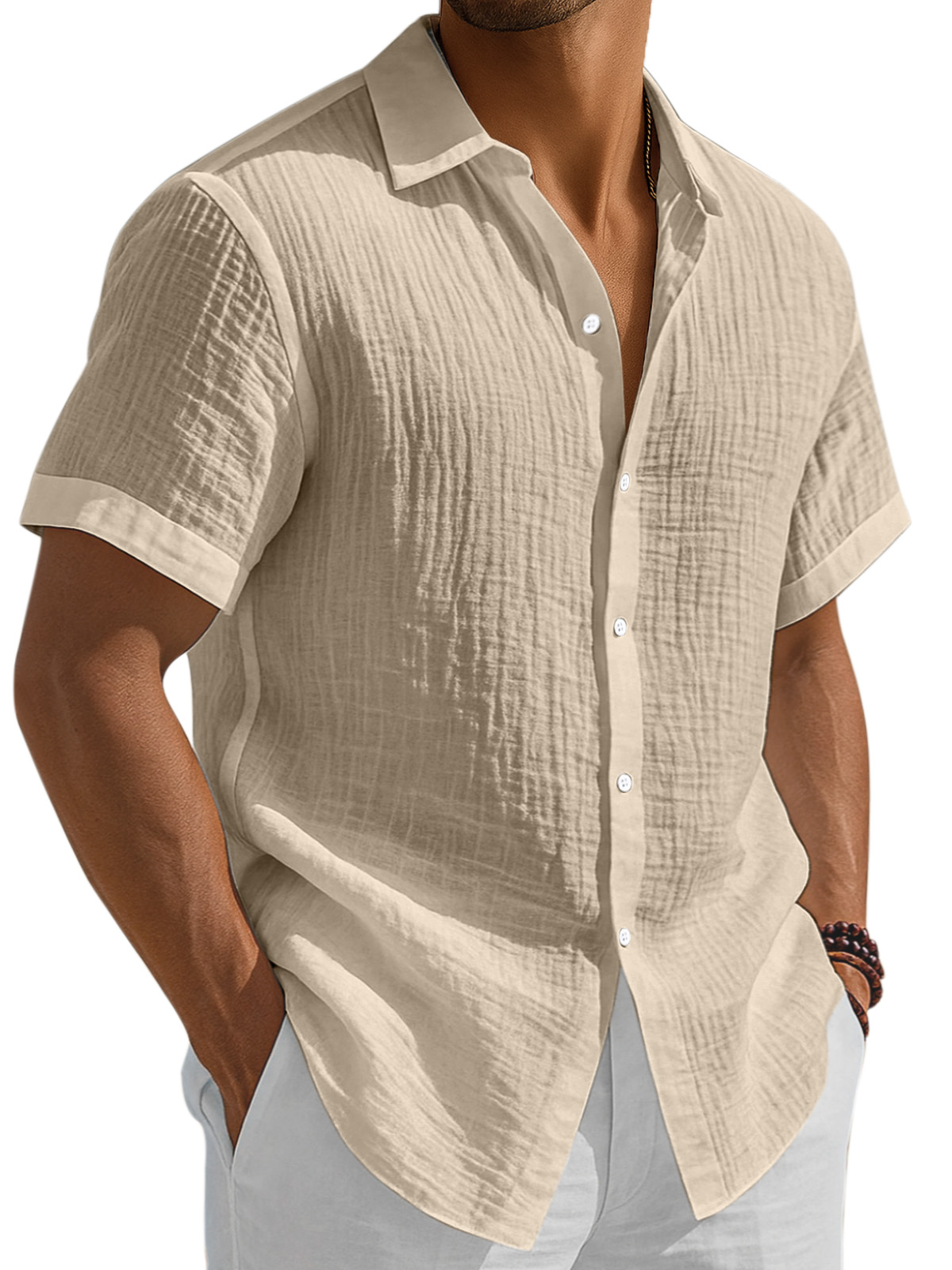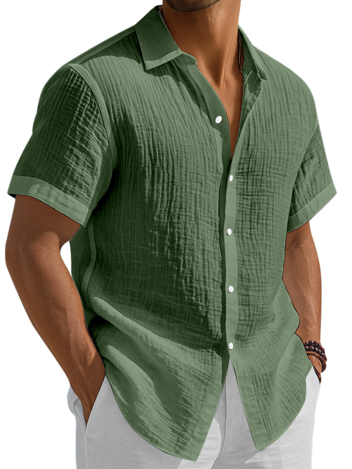 Men's Casual Solid Color Breathable Pleated Button Short Sleeve Shirt
