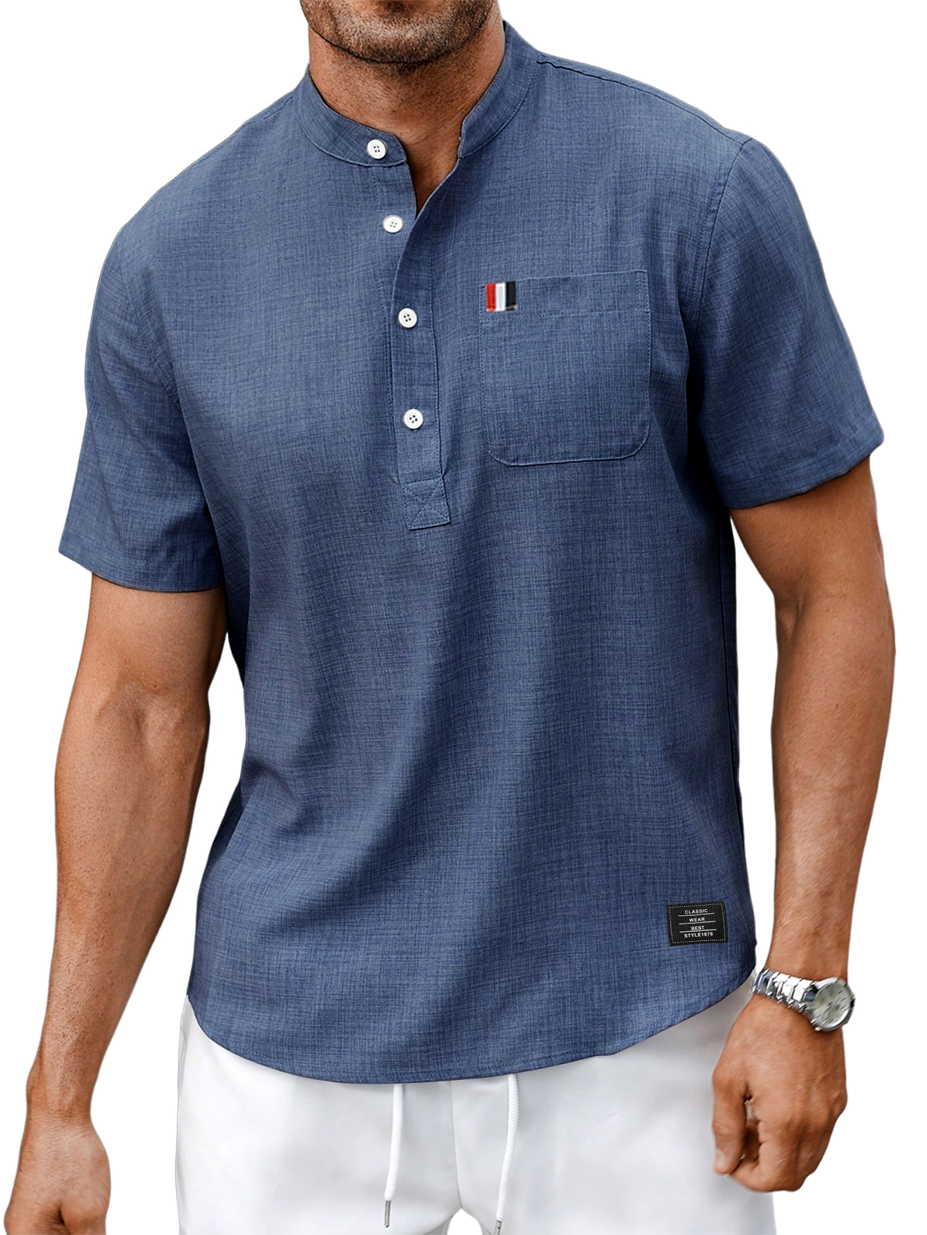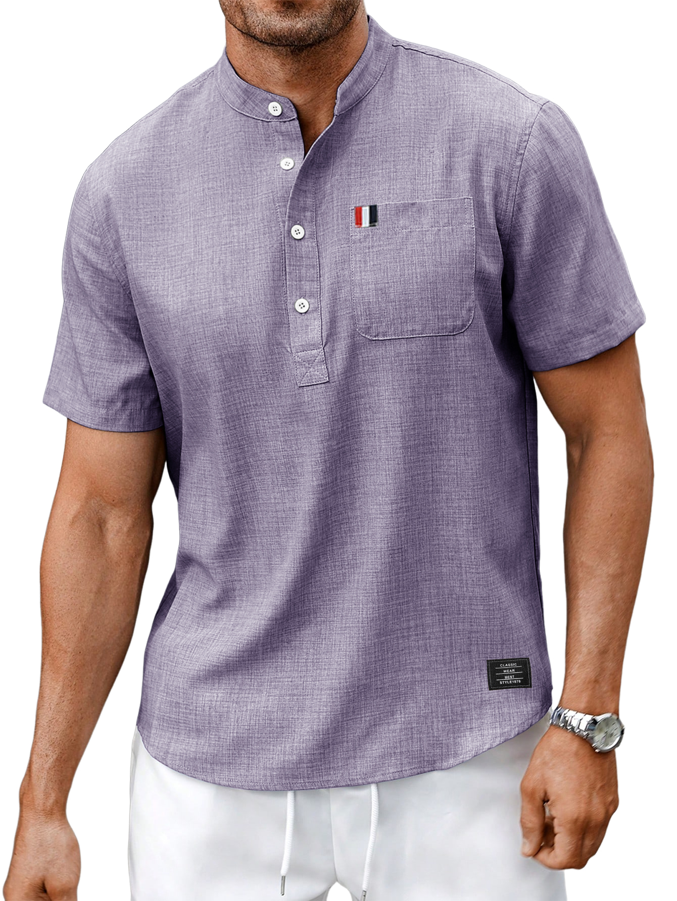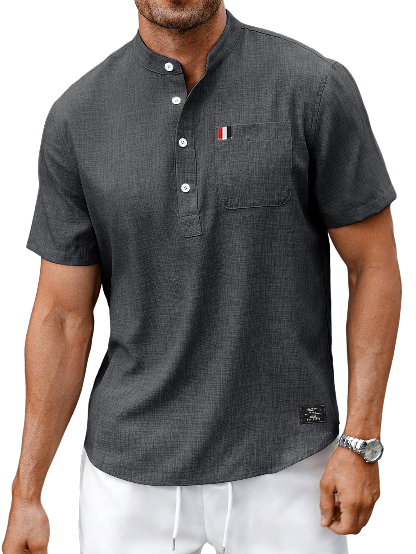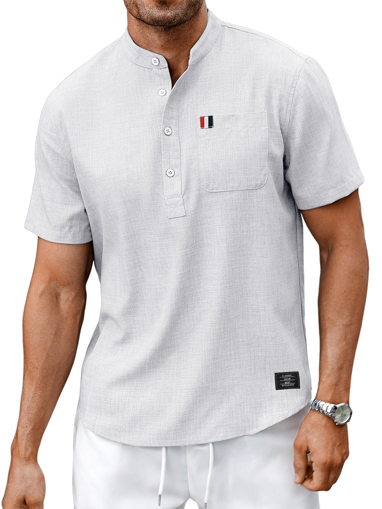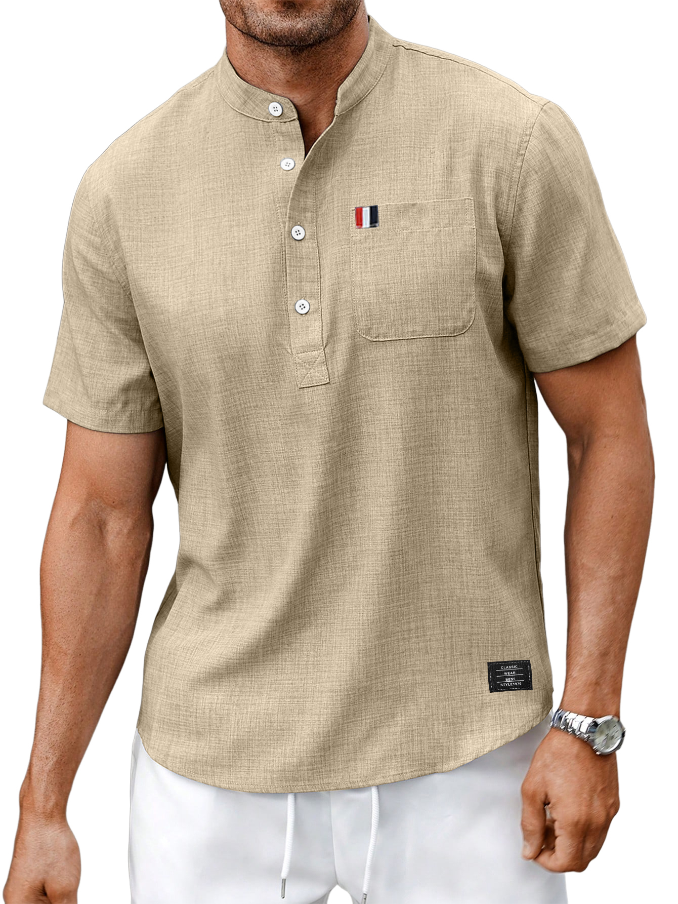 Men's Fashion Casual Cotton And Linen Logo Stand Collar Pocket Short Sleeve Shirt