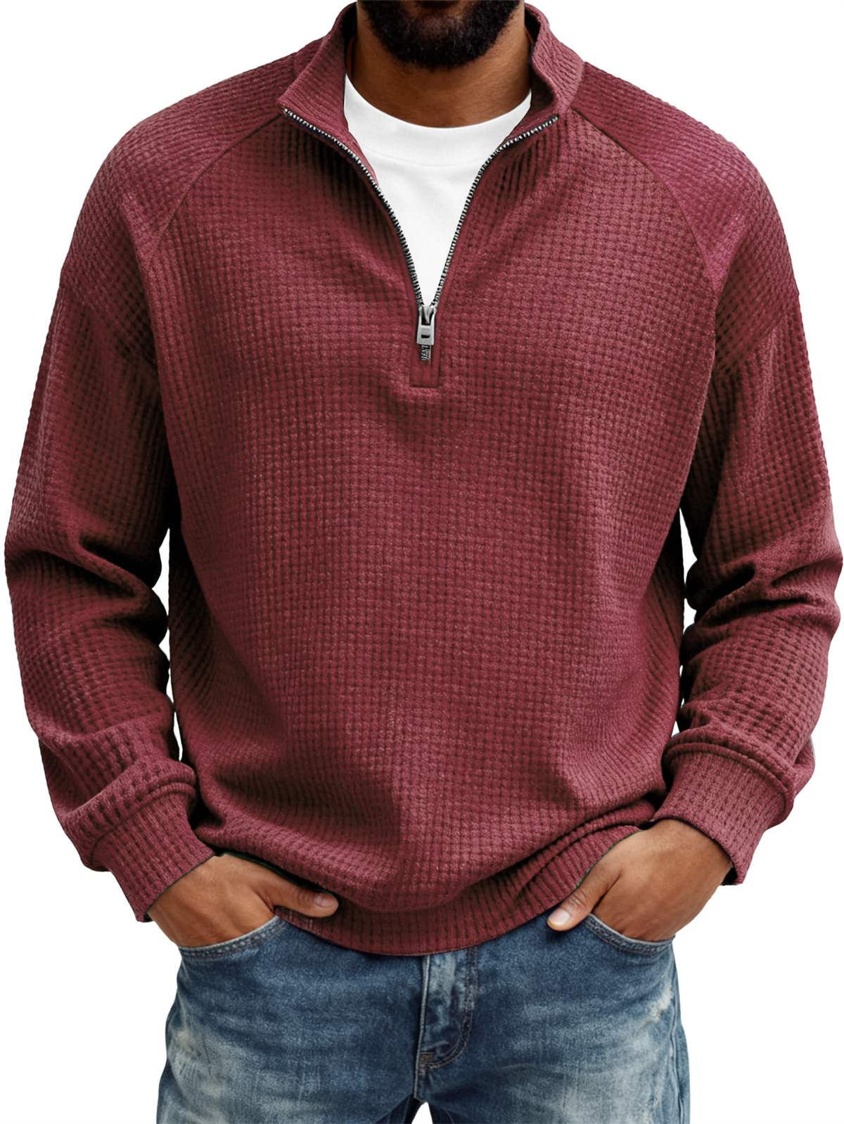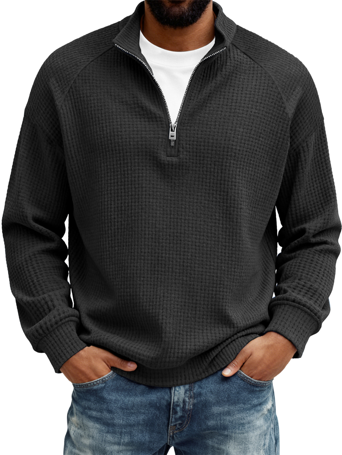 Men's Retro Casual Waffle Fabric Raglan Sleeve Quarter-Zip Long-Sleeve T-Shirt