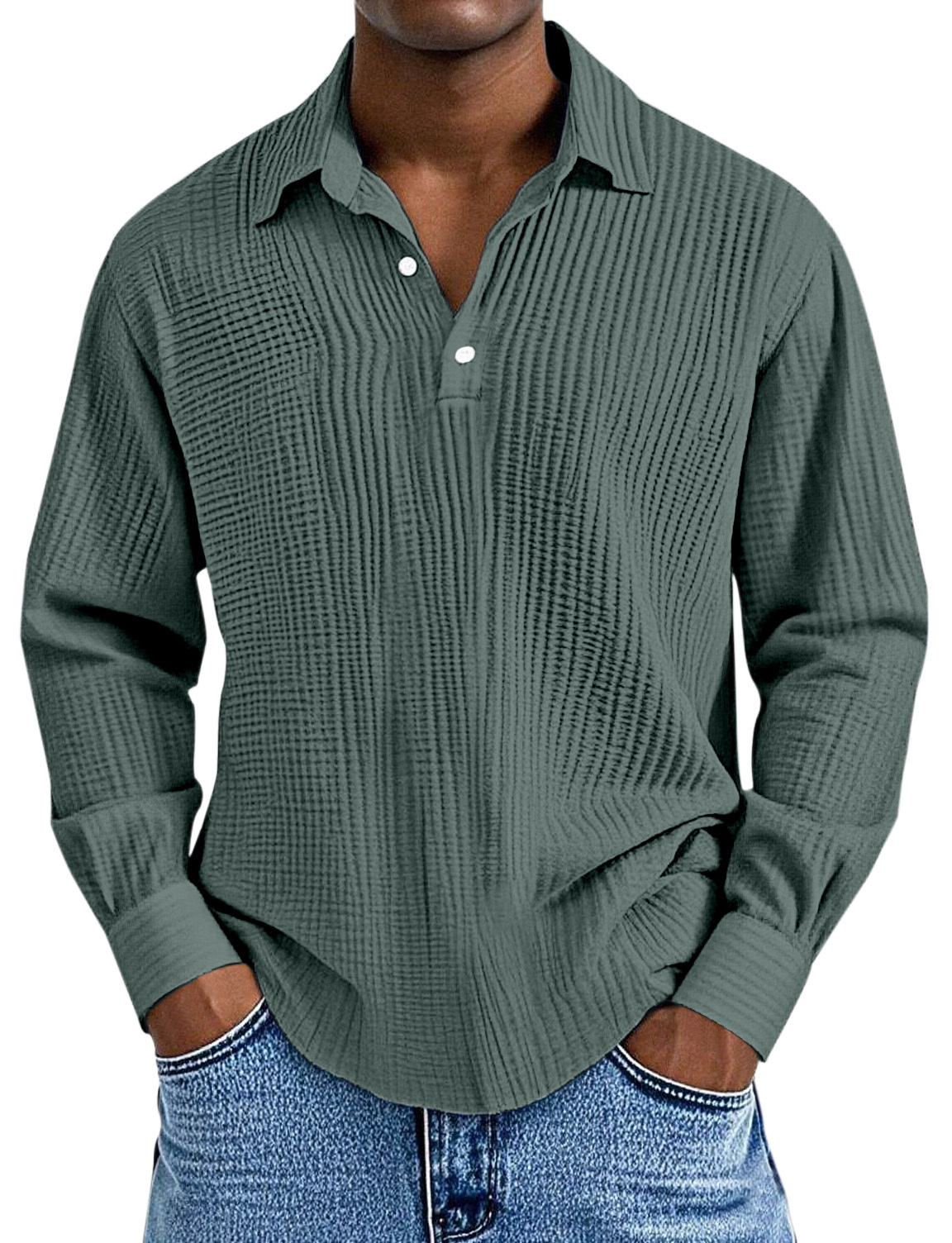 Men's Simple Solid Color Pleated Texture Long-sleeved Lapel Polo Shirt